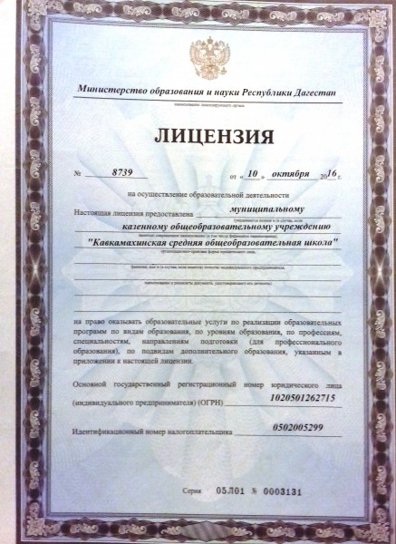 | Полное наименование образовательной организации* | Муниципальное казенное общеобразовательное учреждение "Кавкамахинская средняя общеобразовательная школа имени М.О. Алиева" |