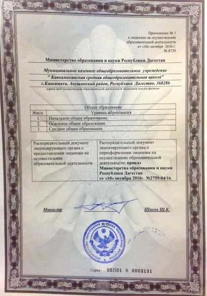 | Адрес местонахождения образовательной организации* | 368288, Республика Дагестан, Акушинский район, с. Кавкамахи улица Школьная 2 |