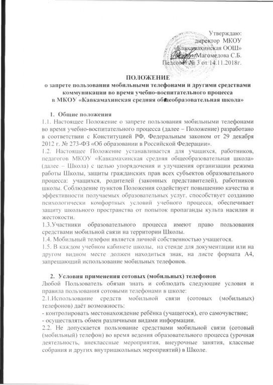 ПОЛОЖЕНИЕ о запрете пользования мобильными телефонами и другими средствами коммуникации во время учебно-воспитательного процесса в МКОУ «Кавкамахинская средняя общеобразовательная школа».jpg